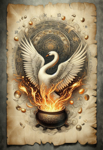 Mythological Aspect: The swan bridges heaven and earth, representing a transformation that combines air and water elements. Swans are equally at home in air, water, and on land or earth. The swan is frequently depicted in alchemical art alongside the crow (nigredo), peacock (cauda pavonis), and phoenix (rubedo) as part of the transformational stages.