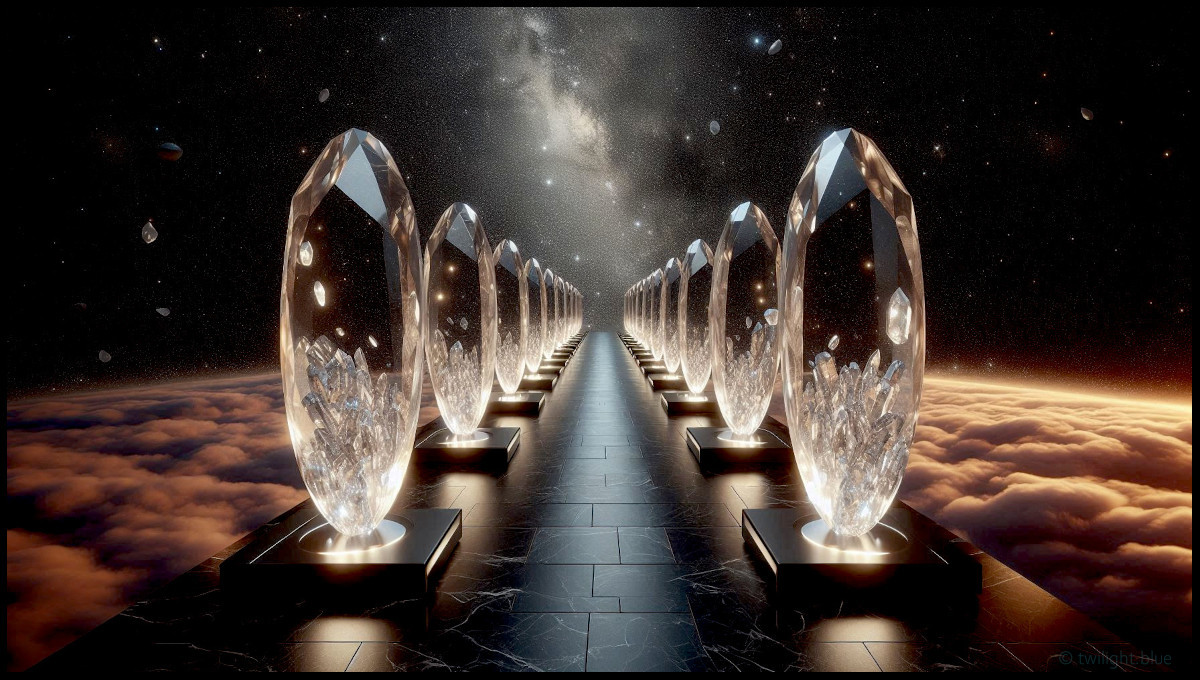 Both sides of this path were lined with single rows of crystalline objects, perhaps a dozen or more. They were all relatively similar in shape and size. Large, tall, oblong, multi-faceted, and composed of clear flawless crystal. All were suspended in air, not mounted or set on the ground, and they were softly glowing, glistening with sparkling white light.