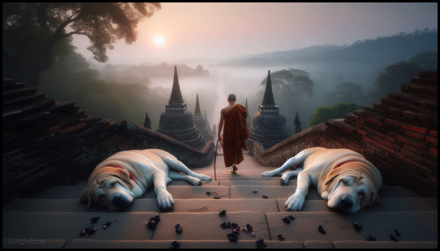 There was one final part to my vision, or visitation, but I'm not sure how relevant it is. When I exited the temple, there were long descending steps. On the steps lay two large sleeping dogs. I felt uneasy and cautiously stepped over them, so as not to disturb their rest and maybe be bitten. That's where the experience fully concluded.
