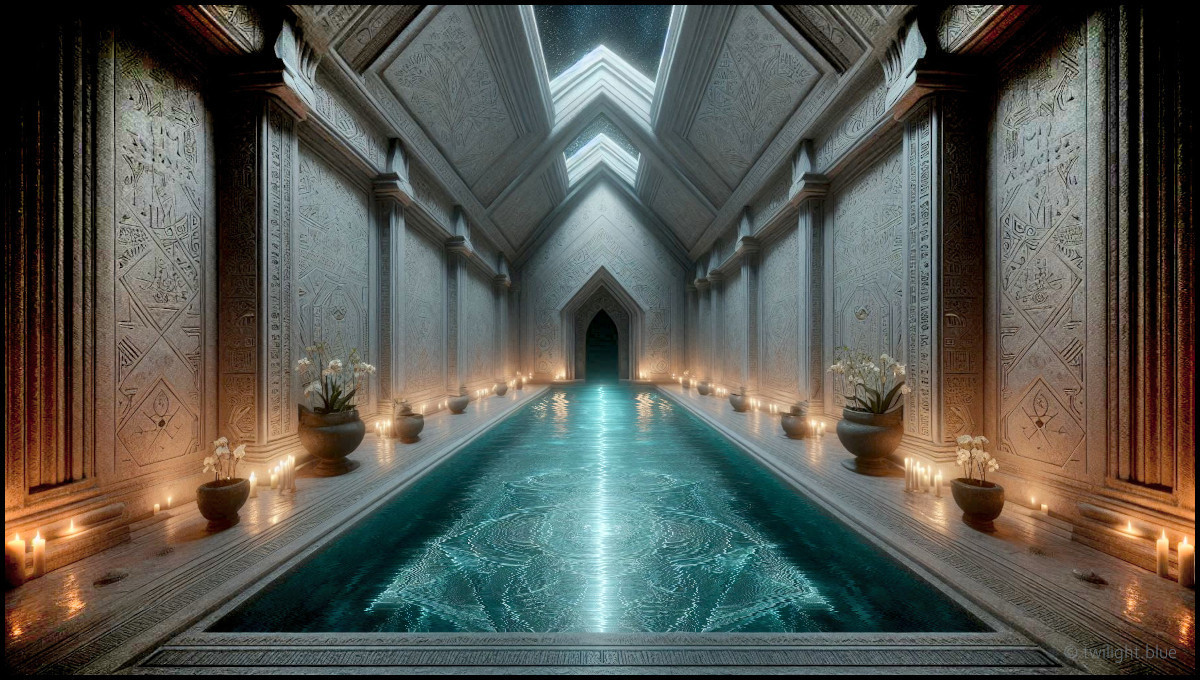Ahead of me lay a long narrow pool, filled with shimmering, luminous, crystal clear water. The pool was raised a few feet above the floor, with stone siding. It seemed to stretch off into infinity. There may have been a gateway or portal of some sort at the far end, but all I can remember is a darkness beyond, a depthless obscurity, as if the fountain or pool had no point of origin.